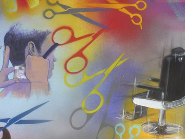 Owners Jules and Zebi of Gentleman Jacks Barbershop, Nantwich, commissioned me to paint a large canvas for their barbershop. The 100 x 100 cm canvas features tools of their trade; combs, scissors, moustaches and beards of course! The couple are illustrated too along with their dog! I really enjoyed this project.